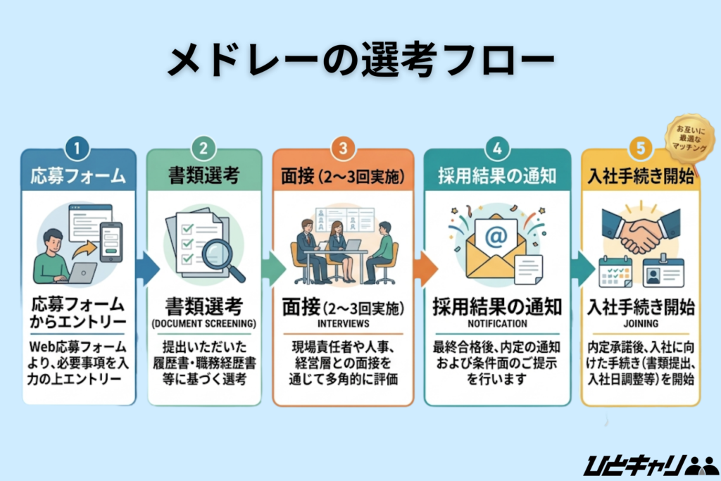 メドレーの選考は、スピーディかつ丁寧に進められる点が特徴です。
