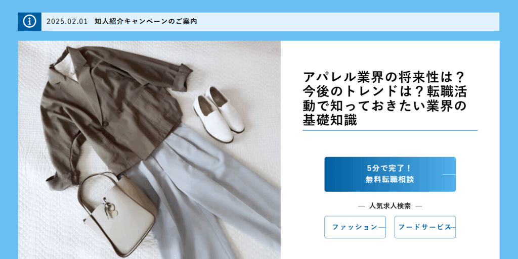 エランはアパレル特化型ならではの情報量とサポート力が強みで、未経験から経験者まで幅広い層が利用しやすいエージェントといえるでしょう。