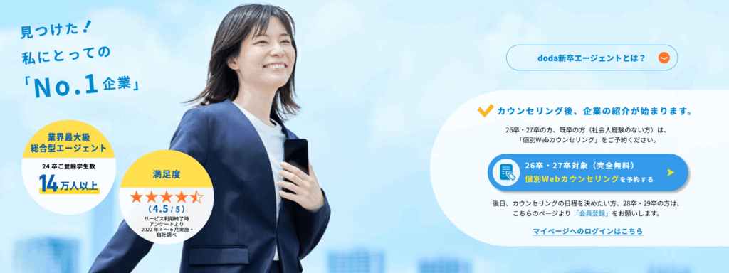 doda新卒エージェントは、「まなぶ」と「はたらく」をつなぐ就活支援をコンセプトに、学生一人ひとりに寄り添った就活支援サービスです。